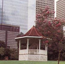 The Bandstand -- A copy of the original turn of the century Houston City Park bandstand, this late Victorian style structure is a focal point for Sam Houston Park and an appropriate setting for a great variety of special events.