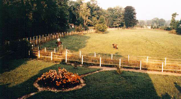 View of the park with its bridle path going through a rich variety of trees: maples, birches, American and European oaktrees, wild cherrytrees, cedars, blue firs, Austrian black pinetrees, ashtrees, chestnut trees.... A testimony to the vast forests that used to cover Europe.