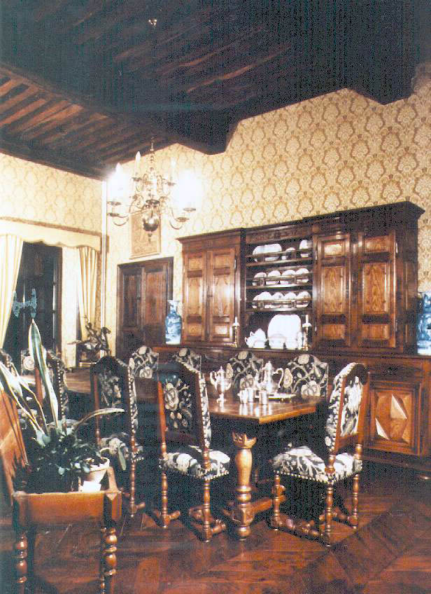 The reception room : divided up into two inequal parts by a wall (with fonctionnal openings) at the beginning of the century, now used as a dining room (heightened by five meters high ceilings "a la francaise”) containing a marble fireplace equipped with a heat-conserving system.