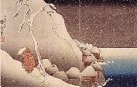 The Priest Nichiren in the Snow. Woodcut.